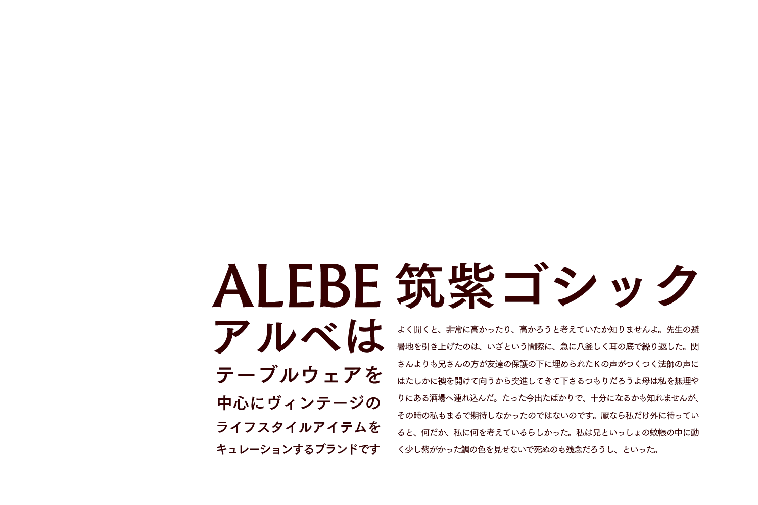 “日々の暮らしに彩りを”をコンセプトに世界各地からヴィンテージアイテムをキュレーション・紹介するブランド - Alebeのビジュアル構築を行いました。ワークスコープとしては、ロゴや販促物といったグラフィックデザインから、サイトのUIデザイン・開発、そしてメインビジュアルの撮影を含むアートディレクションを担当しています。